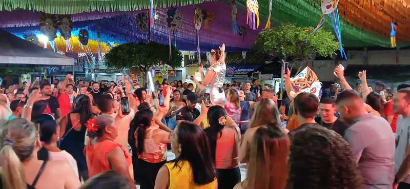 A noite também contou com a presença do prefeito Pompilím, acompanhado da primeira-dama Dra. Áurea Brandão, além do vereador Clodomar Mineiro e da Secretária Municipal de Assistência Social, professora Erivalda Domingues. As autoridades prestigiaram o evento, circularam pelo circuito da festa e cumprimentaram foliões e comerciantes, reforçando o apoio à realização do Carnaval como um momento de valorização da cultura e de lazer para a população.