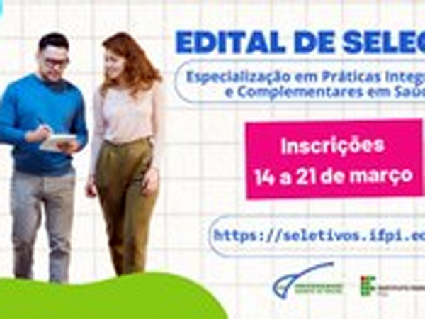 O Instituto Federal do Piauí lança edital com oferta de vagas para a Especialização em Práticas Integrativas e Complementares em Saúde, realizada à distância em parceria com a Universidade Aberta do Brasil – UAB.